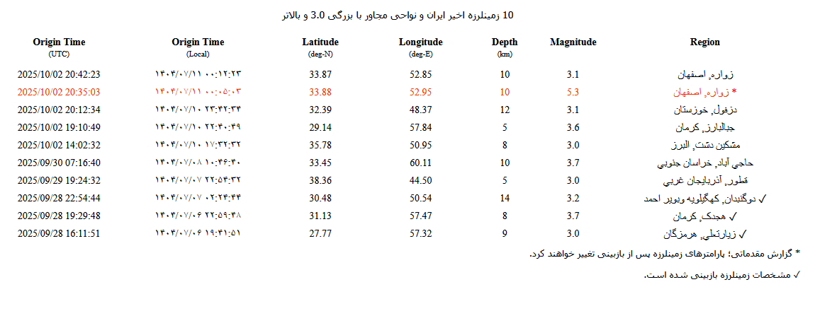 به گزارش مشرق، شبکههای لرزهنگاری مرکز لرزهنگاری کشوری مؤسسه ژئوفیزیک دانشگاه تهران در ساعت ۰۰:۰۵ دقیقه بامداد امروز جمعه ۱۱ مهرماه این زمینلرزه را ثبت کردند.